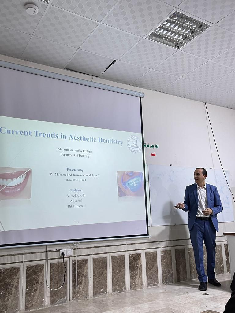 On Monday, 9th October 2023, the Department of Dentistry at Al-Maarif University College held a scientific seminar entitled (Current Trends in Aesthetic Dentistry) presented by Dr. Mohammed Abdulmunim with several students of the departments. The most important topics of the seminar were the importance of aesthetics dentistry and its development in recent years, as well as the emergence of devices and materials that make dental treatment easier and better to get a more beautiful and brighter smile. During the seminar, some topics related to aesthetics dentistry and the materials used in this field and the latest techniques used were discussed to maintain the teeth and treat them to appear in an approach to the natural. The seminar was attended by the Head of the Department of Dentistry, the Rapporteur of the Department and several dental lecturers and students.