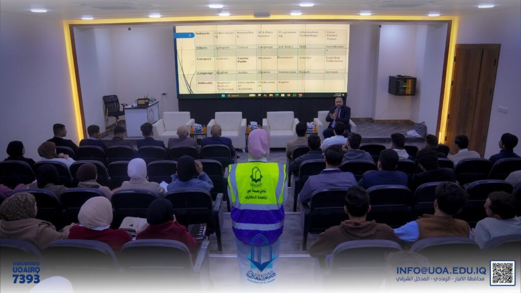 The workshop was delivered by Prof. Dr. Sufyan Tayeh Faraj, Head of the Department of Cybersecurity Engineering Techniques, and was attended by a number of department students, along with the Dean of the College of Engineering Technologies, Asst. Prof. Dr. Mohammed Rabeea Al-Dahan, the Dean of the College of Science, Asst. Prof. Dr. Mohammed Ibrahim Khalaf, and the Assistant Dean of the College of Engineering Technologies, Mr. Mundhir Nayef.